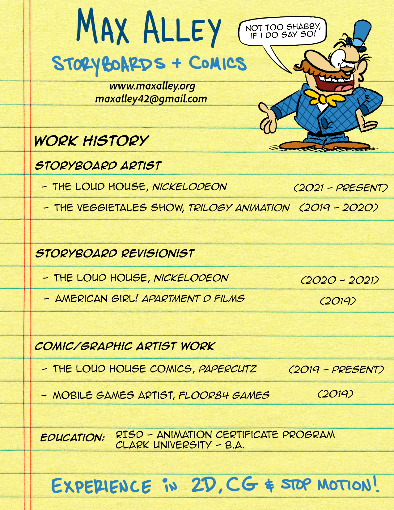 I graduated college with a B.A. in Sociology and thought, “Oh, animation is neat. Why haven’t I been more interested in that?” After pursuing an Animation Certificate Program at Rhode Island School of Design, I’m currently working in the animation industry while fulfilling my love of all things animated! Additionally, I have experience storyboarding on 2D, CG, and stop motion projects.